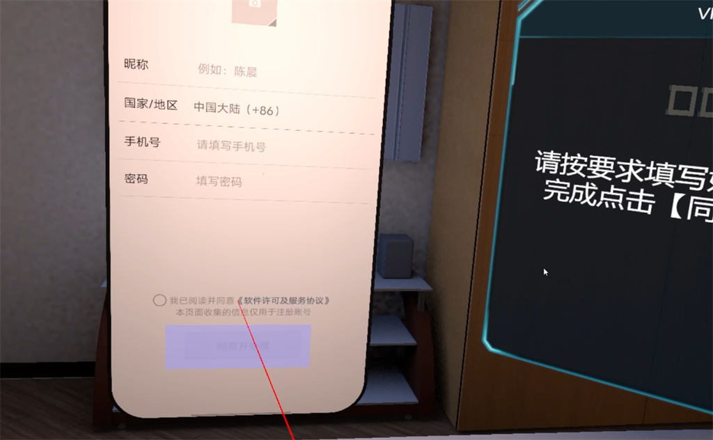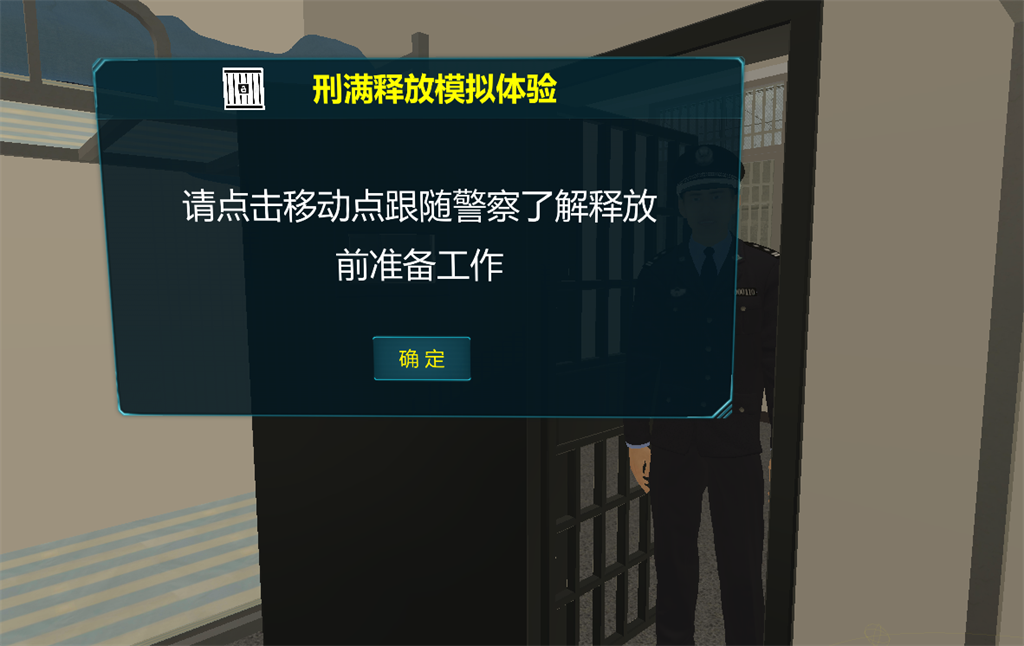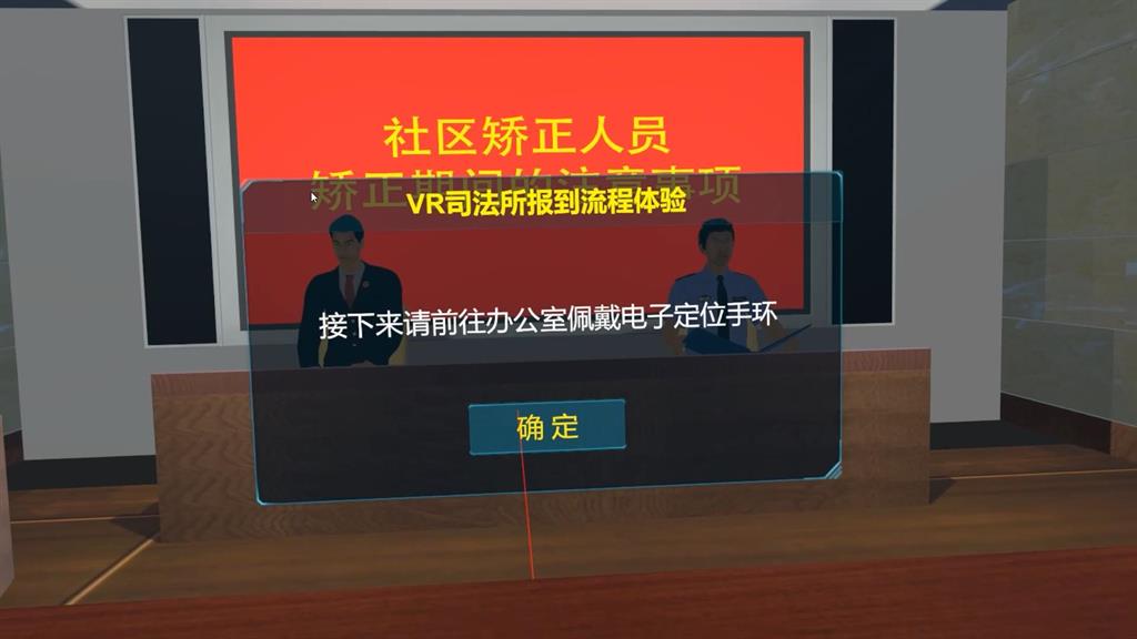 模擬整個假釋報到流程,體驗者以第一視角攜帶相關(guān)證明到矯正中心完成相應(yīng)的報到程序,包括填寫資料、入矯談話、入矯宣告、入矯誓詞、簽訂幫教協(xié)議等。
