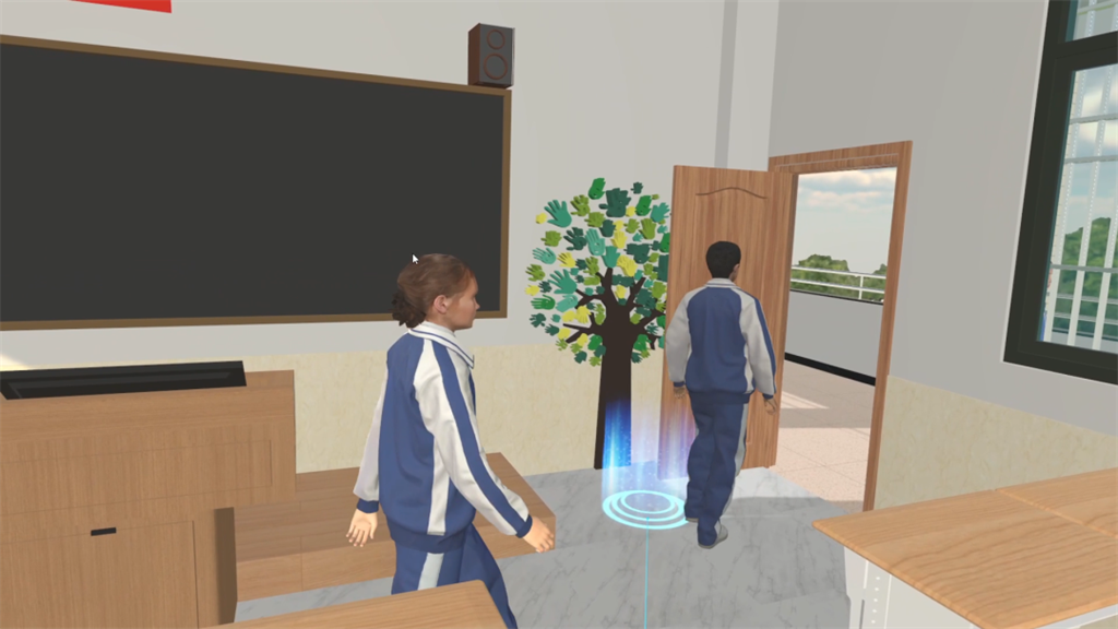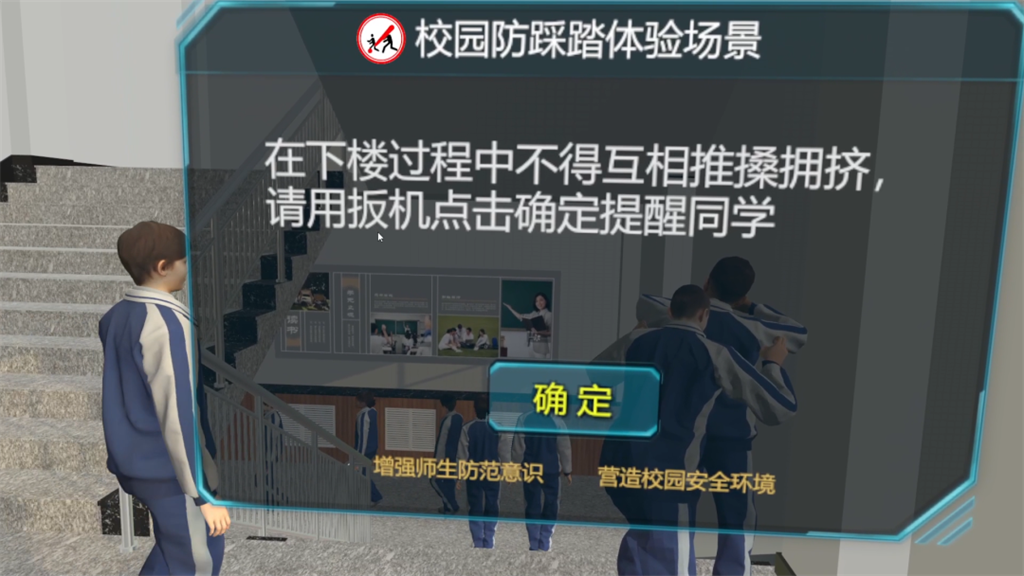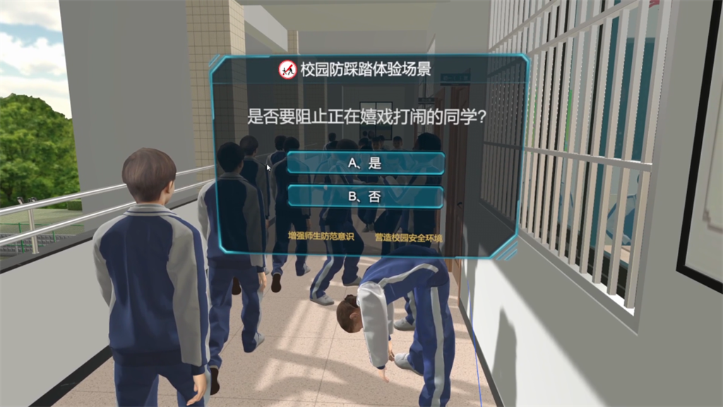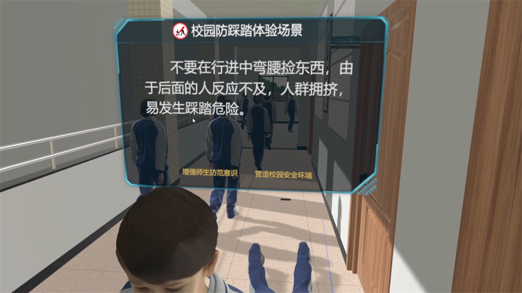 校園VR防踩踏體驗場景軟件從學(xué)校日常的早操入手,更具真實感與代入感;在校園早操準(zhǔn)備過程中,學(xué)生們需集體前往操場,期間有同學(xué)在彎腰系帶、樓道走廊內(nèi)亂竄打鬧、人群擁擠處彎腰下蹲撿東西、在人流處逆向跑步、在下樓樓梯時互相推操擁擠、在下樓樓梯發(fā)生意外跌倒后,后面未知的人群依然涌動前行的狀況。