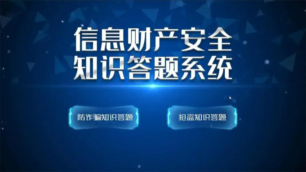 設(shè)備待機(jī)畫面為“信息則產(chǎn)安全知識答題系統(tǒng)”動(dòng)態(tài)演繹,下面分為防詐騙知識答題模塊和搶盜知識答題模塊。