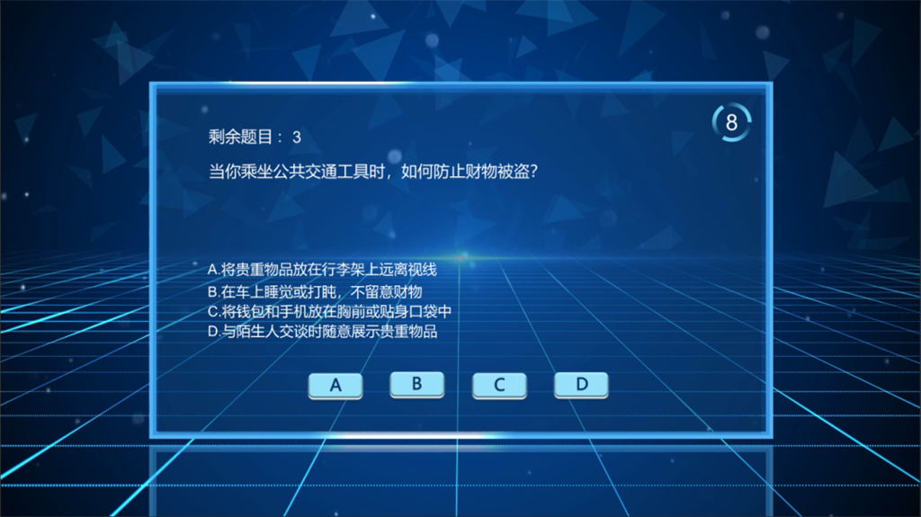 針對搶盜風(fēng)險(xiǎn),系統(tǒng)以互動(dòng)答題的形式模擬日常生活中可能遇到的搶劫、盜竊等突發(fā)情況。例如,在公共場所的休息區(qū),如何防止財(cái)物被盜,或在公共場所財(cái)物被盜等場景。用戶需要在模擬情境中選擇正確的應(yīng)對措施,系統(tǒng)會根據(jù)用戶的選擇提供實(shí)時(shí)反饋,幫助用戶學(xué)習(xí)如何冷靜應(yīng)對,采取正確的自我保護(hù)措施。