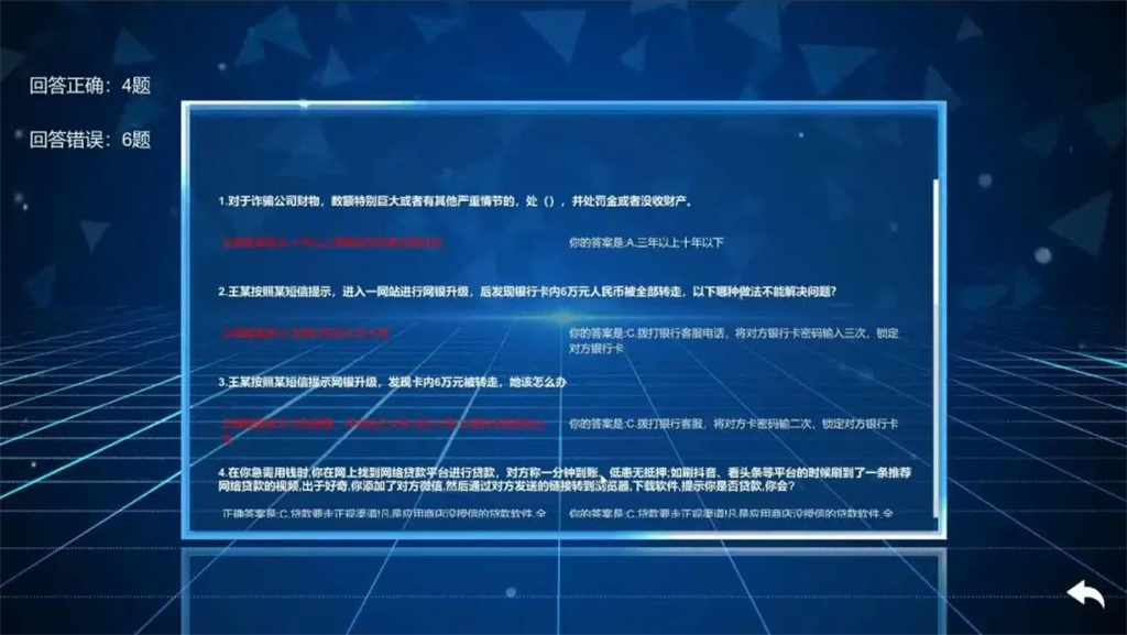 題目涵蓋當(dāng)前流行的詐騙方式,例如刷單詐騙、冒充微信、投資理財(cái),通過簡單的互動(dòng)答題提高預(yù)防意識。整個(gè)體驗(yàn)流程以互動(dòng)答題的形式展開,玩家需要從多個(gè)選項(xiàng)中選擇正確選項(xiàng),體驗(yàn)完系統(tǒng)會給出評分和實(shí)時(shí)反饋,幫助用戶識別詐騙套路。用戶不僅可以通過答題學(xué)習(xí)詳細(xì)的詐騙知識,還能在互動(dòng)中掌握全面的防范措施和安全建議,例如如何保護(hù)個(gè)人信息、避免上當(dāng)受騙等。