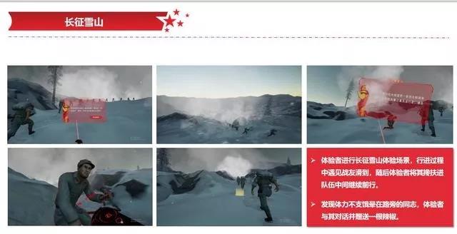 工作人員戴上VR眼鏡,可以重溫長(zhǎng)征路,體驗(yàn)當(dāng)年農(nóng)軍爬雪山的艱難。在雪山體驗(yàn)場(chǎng)景里,你將扮演一名紅軍戰(zhàn)士,在行進(jìn)過程中遇見戰(zhàn)友滑到,遇見體力不支餓暈在路旁的同志,還會(huì)遇見教科書本上為了革命而犧牲的軍需處長(zhǎng)。這些原本在教課書上發(fā)生的故事情節(jié),通過VR我們蹦栩栩如生在眼前展示。
