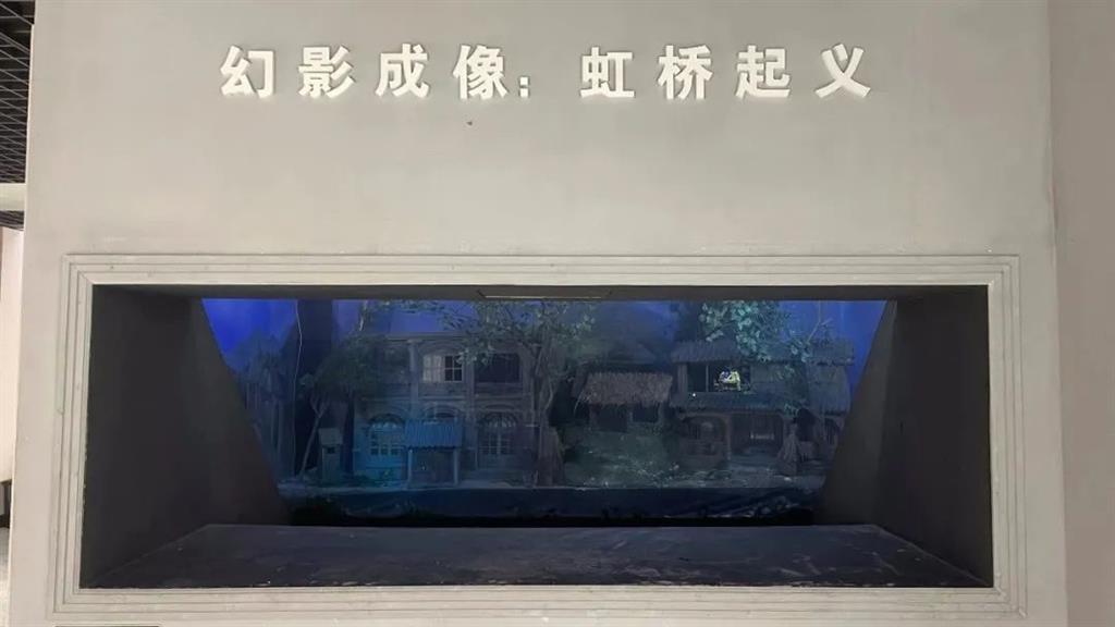 幻影成像系統(tǒng),呈現(xiàn)虹橋起義的內(nèi)容展現(xiàn)。利用多機(jī)多方位攝像技術(shù)及人眼視覺(jué)心理特性,再將所拍攝區(qū)域?qū)⑼队爱?huà)面投射在特制媒介玻璃上,與實(shí)景模型結(jié)合,合成最終3D畫(huà)面,演繹出虹橋起義故事。